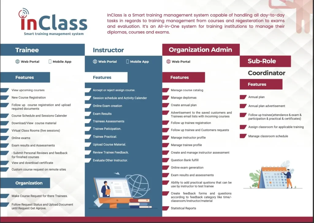 InClass capable of handling all day-to-day tasks in regards to training management from courses and regesteration to exams and evaluation. It’s an All-in-One system for training institutions to manage their diplomas, courses and exams.